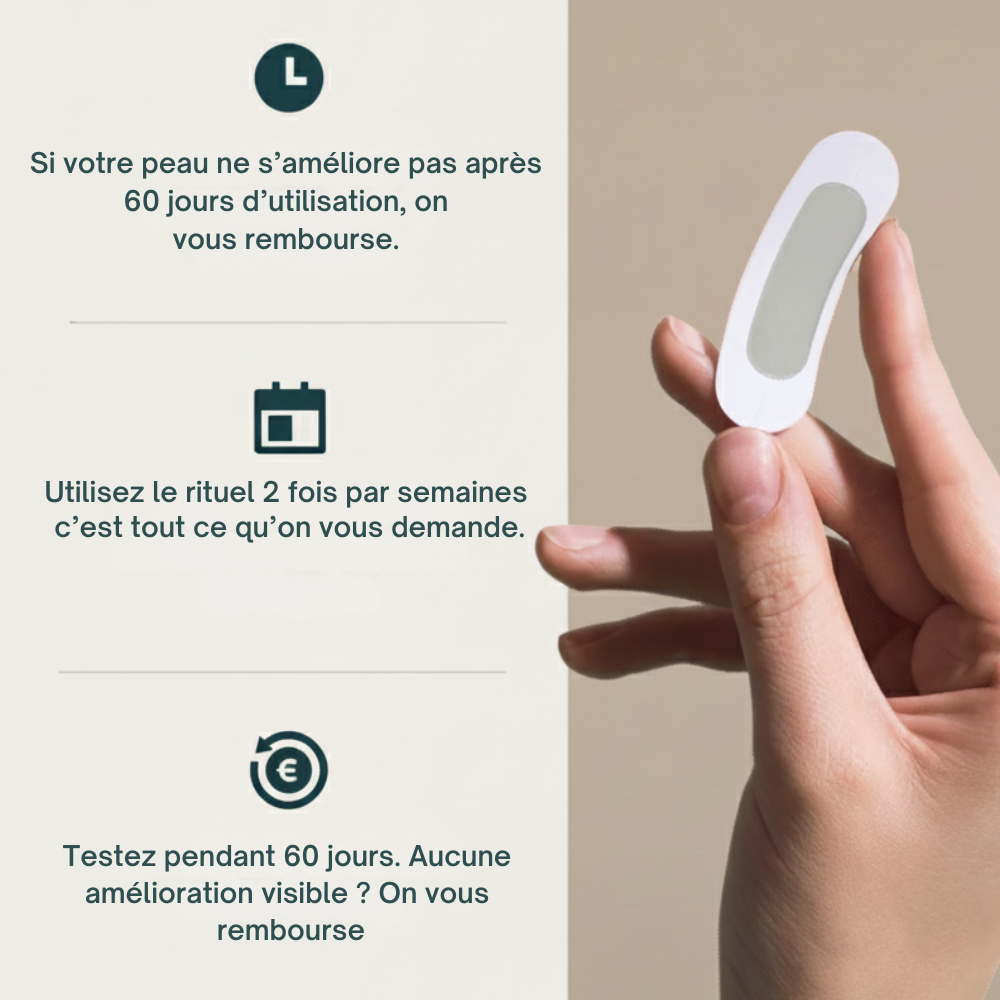 Essayez nos patchs en toute confiance. Si vous ne constatez pas de résultats visibles, vous avez 60 jours pour changer d’avis et être intégralement remboursé.